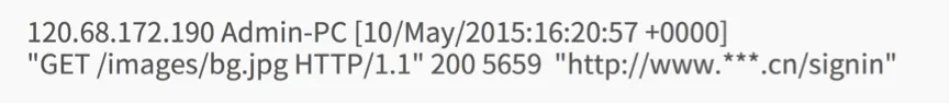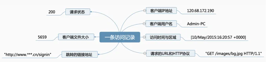 下面我们来学习如何有效的去分析数据源和KPI 。 我们知道,在Web日志中,每条日志数据通常表示着用户的一次访问行为,下面我给 大家展示一条示例数据,如下图所示: