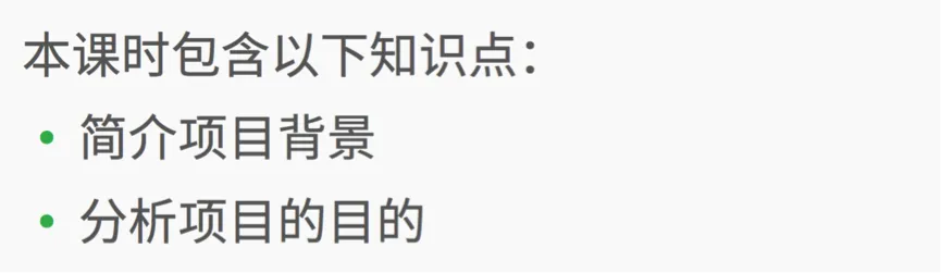 本课时简述分析一个项目产生的背景,以及该项目能给企业带来那些良好的结果, 从而让大家更好的去把握项目需求。该课时主要包含以下知识点,他们分别是:对项目背景做简要的概述以及对项目的目的做合理的分析。如下图所示: