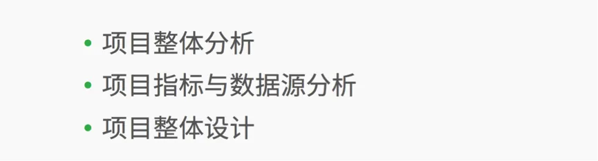 本课程我们对项目进行了整体的分析,并指导大家去分析项目指标和数据源,以及帮助大家去设计项目的开发流程等知识,大家学完本课程应该掌握以下知识,其内容如下图所示: