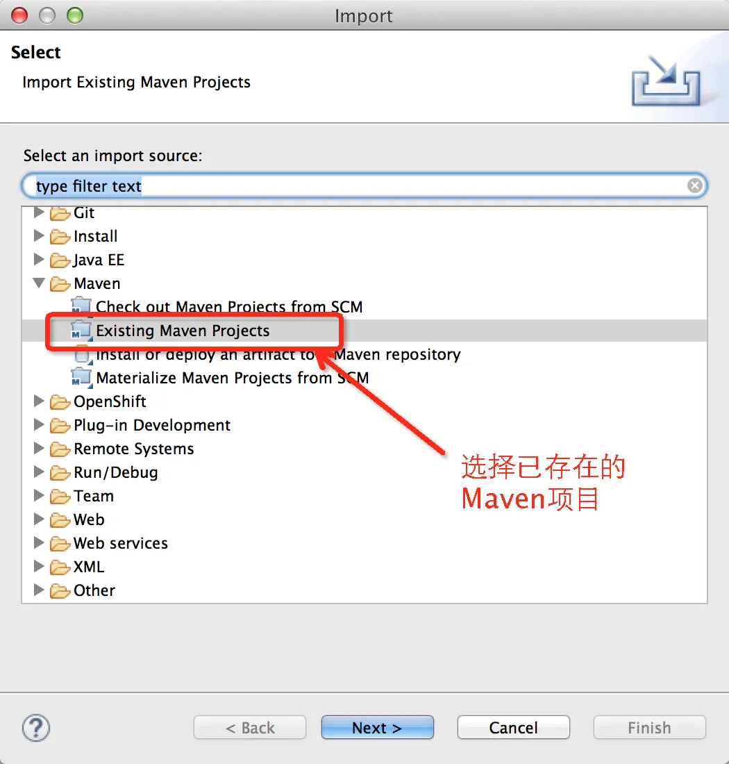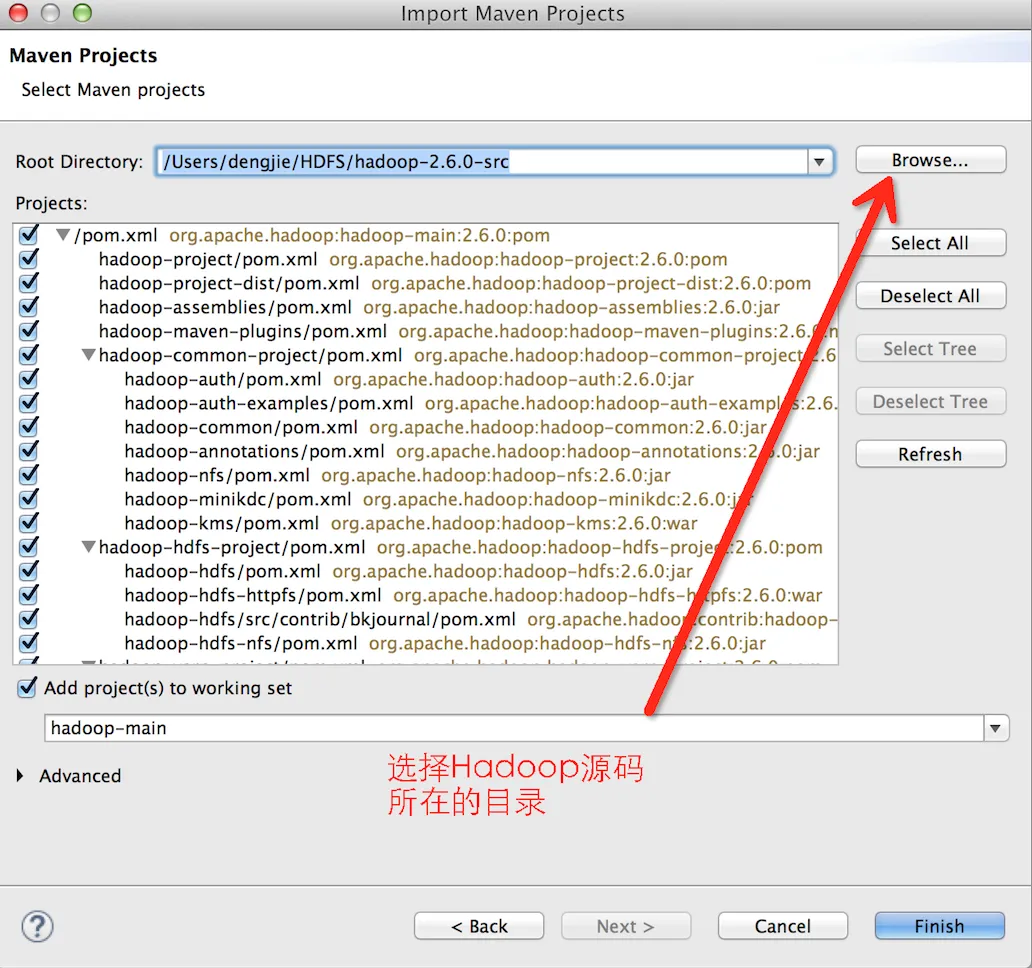 若使用Maven结构,可直接导入Hadoop的源码文件,Hadoop-2.6.0-src工程就算Maven结构的。导入过程如下图所示: