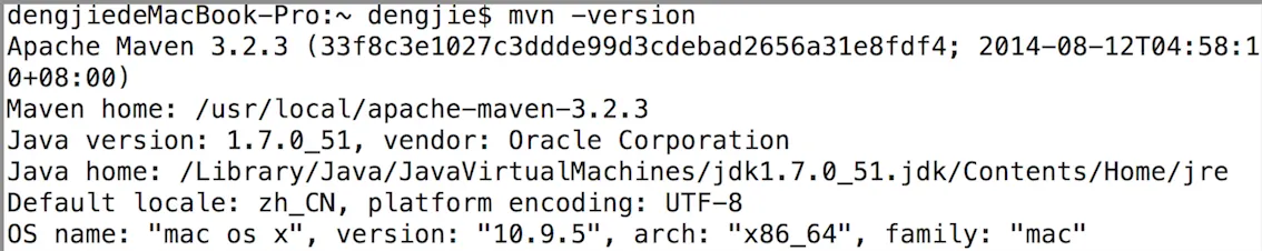 $ cd /usr/local $ sudo mv /Users/dengjie/Downloads/apache-maven-3.2.3-bin.tar.gz ./ $ sudo tar -xvf apache-maven-3.2.3-bin.tar.gz