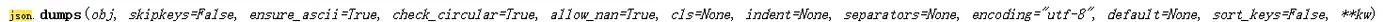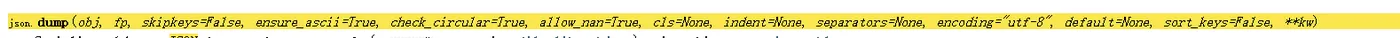 ensure_ascii:默认值True,如果dict内含有non-ASCII的字符,则会类似\uXXXX的显示数据,设置成False后,就能正常显示