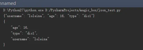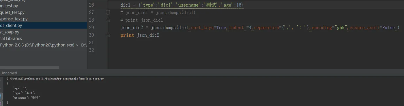 dic1 = {'type':'dic1','username':'loleina','age':16} json_dic1 = json.dumps(dic1) print json_dic1 json_dic2 = json.dumps(dic1,sort_keys=True,indent =4,separators=(',', ': '),encoding="gbk",ensure_ascii=True ) print json_dic2