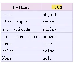 从上面2个例子的测试结果可以看到,python的一些基本类型通过encode之后,tuple类型就转成了list类型了,再将其转回为python对象时,list类型也并没有转回成tuple类型,而且编码格式也发生了变化,变成了Unicode编码。具体转化时,类型变化规则如下所示: