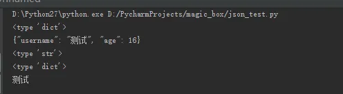 if __name__ == '__main__': # 将python对象test转换json对象 test = {"username":"测试","age":16} print type(test) python_to_json = json.dumps(test,ensure_ascii=False) print python_to_json print type(python_to_json) # 将json对象转换成python对象 json_to_python = json.loads(python_to_json) print type(json_to_python) print json_to_python['username']