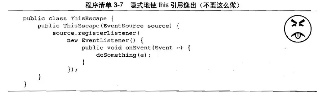 上述构造函数好像没啥问题,至少我看本书之前看不出。构造函数中的对象是this,其他譬如引用类属性的拥有者为this,如果将这哥匿名类传递给source,source如果对其进行了引用,而这时候构造函数还没结束即没有创建ThisEscape的对象,这个匿名类也还没构造,即空。当且仅当对象的构造函数返回时,对象才处于一个可预测和一致的状态。