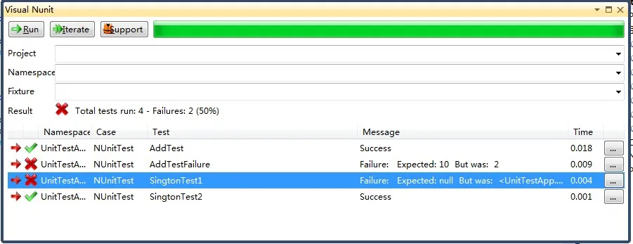 注:在上面的代码中引用 NUnit.Framework,使用TestFixture标注这是用于测试的类,在其中使用 Test表示具体的测试用例。可以看到单元测试中最重要的是断言,其他完全交给框架自动化。测试结果可以通过插件及时看到: