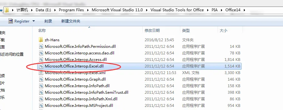 其实在使用Visual Studio进行Office的Excel开发时,Microsoft.Office.Interop.Excel.dll 可以在类似于下面的目录中找到。并不需要再在网上下载了。