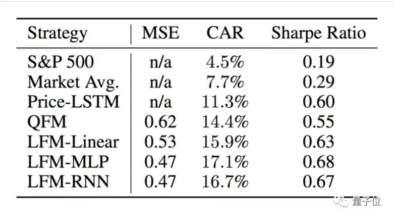今年NIPS顶会上,Alberg和Lipton分享了他们的一篇论文,Improving Factor-Based Quantitative Investing by Forecasting Company Fundamentals。这篇论文指出,他们研发的选股AI(下图的LFM-MLP策略)在测试阶段,就产生了17.1%的年化率,而标准的数据模型(下图的QFM,quantitative factor model,传统的计量经济模型)只能达到14.4%。