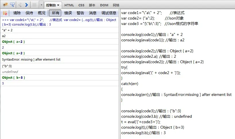 code2是一个json对象(关于json定义参考:深入浅出JSON),所以第8行输出Object { a=2},如果用alert(code2)会弹出[object Object]。第9行输出2。第10行呢,由于code2是一个json对象,不是一个字符串,因此eval在这里没有起作用,原样返回,所以跟第8行输出一样。第11行呢,由于code2已经是一个json对象,把json对象两边加一个括号进行运算的结果是什么呢,JS中这个语法是错的,所以这行会报异常,如果我们捕获一下异常输出会是什么呢,就是新手非常头痛的“missing ] after element list”了。