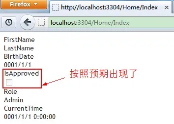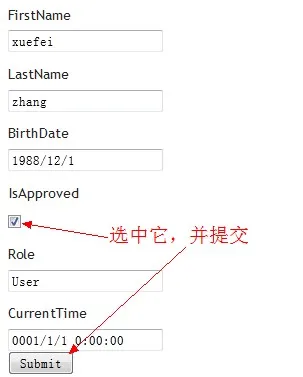在前面有提到过当呈现一个CheckBox时,HTML helper方法创建一个hidden input元素来保证我们能够获取一个没有选中的值,这会稍微对Model绑定有一些影响,因为value provider将会把两个值作为字符串数组提供给我们。