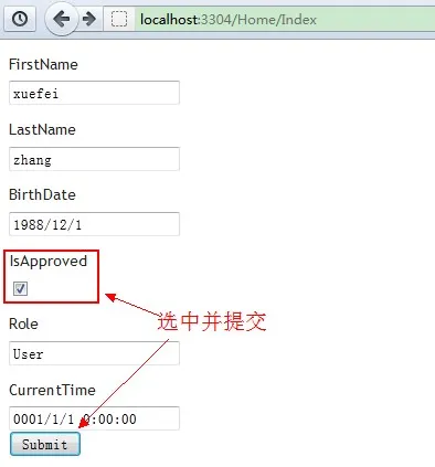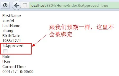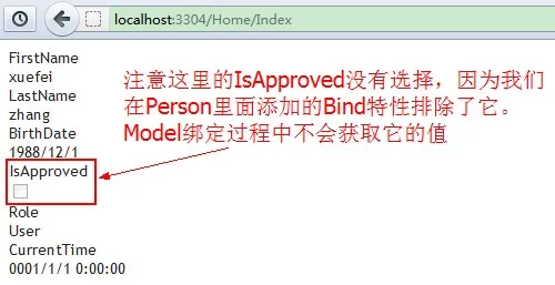 对Person类添加了Bind特性,排除了IsApproved属性,然后添加Controller如下: