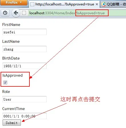 接着继续测试,刚才不是有说到关于策略重写的问题吗,这里我们对【HttpPost】的Index action的参数添加一个Bing特性如下: