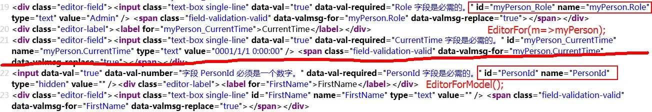 我们使用了EditorFor helper方法来对Person对象生成HTML,lambda表达式的输入是一个model对象(用m代替),当使用这种方式以后,生成的HTML元素的属性名会有一个前缀,这个前缀来源于我们在EditorFor里面的变量名myPerson。运行以后可以看到页面源代码如下: