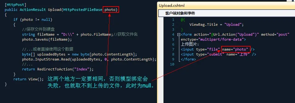 为了接收上传的文件,需要定义一个action方法并接收一个HttpPostedFileBase类型的参数。然后,model binder将会使用跟上传的文件一致的数据填充这个参数。如下: