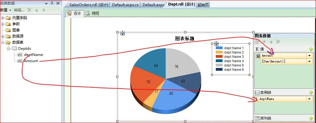 点击图表右边那块区域,将对应的字段拖动到相应的位置,主要是显示是Amount数据,按照deptName分类。