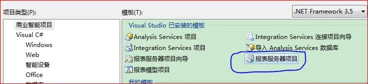 接着:当我们完整安装完SQL2008r2后(我建议大家安装的时候选上所有组件),打开VS2008时里面会有创建商业智能项目模版,选择报表服务项目并创建