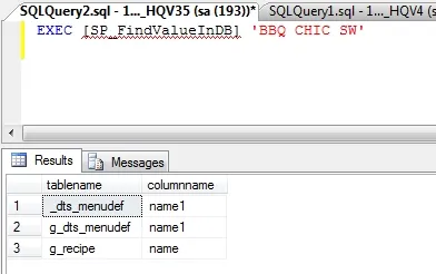 返回三条记录,说明这个值存在于三个表中,分别为_dts_menudef, g_dts_menudef和g_recipe中,字段名分别为name1, name1, name。