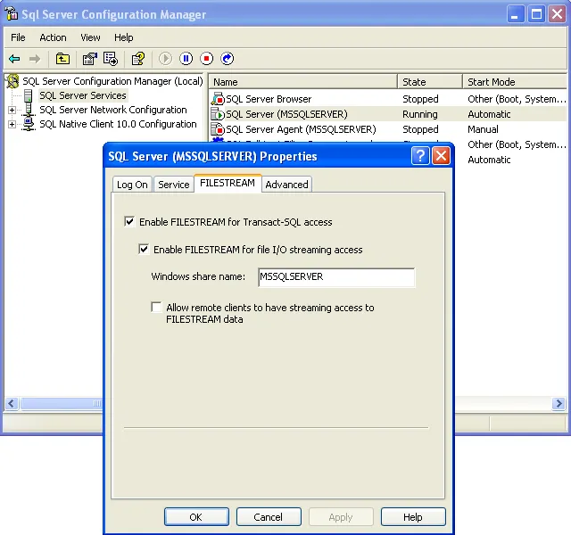 今天安装SQL Server 2008的时候没有注意,忘记了启用FILESTREAM特性,因为默认情况下FILESTREAM是禁用的。安装完成后,再导入一个.bak的备份数据库时提示FILESTREAM feature is disabled,到网上搜了一下,原来启用这个特性很简单,只需要两个步骤: