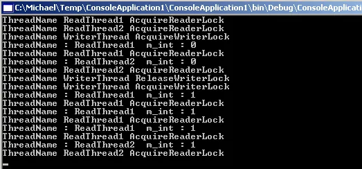 Console.WriteLine("ThreadName " + Thread.CurrentThread.Name + " AcquireWriterLock" );