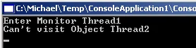 当线程1获取了m_monitorObject对象独占权时,线程2尝试调用TryEnter(m_monitorObject),此时会由于无法获取独占权而返回false,输出信息如下: