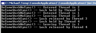 Console.WriteLine( " DoSomeWorkSync() -- Lock held by Thread " +