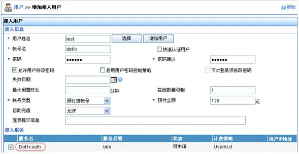 l 在“接入服务”栏中选择该用户所关联的接入服务为“Dot1x auth”(这是上一步配置的服务名)。