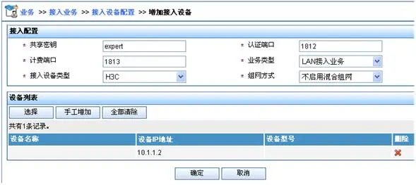 l 在“设备列表”栏中单击“选择”或“手工增加”按钮添加IP地址为10.1.1.2的接入设备;