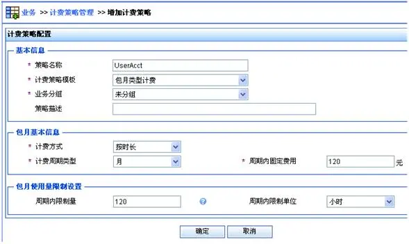 l 在“包月基本信息”栏中设置:计费方式为“按时长”、计费周期类型为“月”、周期内固定费用为“120元”。
