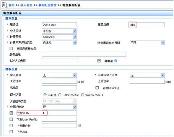 l 在“下发VLAN”文本框中配置授权下发的VLAN ID为“4”(这是根据本示例要求而定的)。