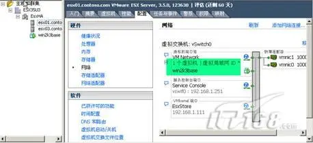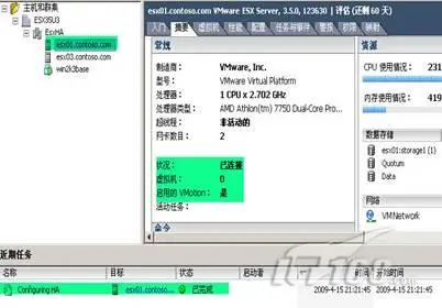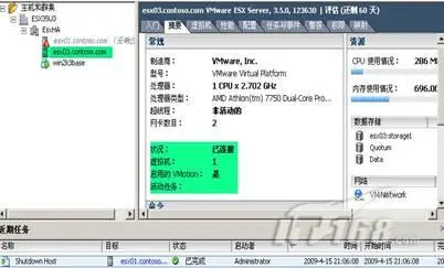3、再选择esx03.contoso.com这台ESX主机,然后查看摘要信息。也可以看到此时上面有虚拟机在运行。而且,此时ESX主机esx01并没有虚拟机在运行。(图15)