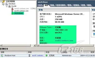 2、此时,再看虚拟机win2k3base的摘要信息,很清楚的显示已在esx03.contoso.com上运行,并保持启动的状态。(图14)