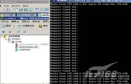 在一个节点(ESX主机)失效时,为了更好的显示出效果来,需要一直PING着虚拟机。以还回的值来判断。此场景中通过关闭虚拟机Win2k3base所在的宿主主机ESX01来实现故障的转移。