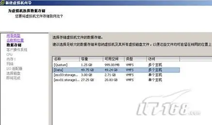 2、 在"数据存储"页,选择虚拟机文件的存放位置。此时,一定要选择之前建立的ISCSI存储中,此处选择"Data"分区。(图1)