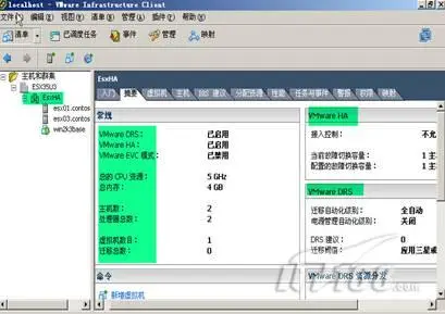 19、完成虚拟机OS的安装后,选择VC控制台的右侧"EsxHA",再点选右侧而板的"摘要",便可以看到截至目前为止的关于VMWARE群集的情况。在前文也提到,当你启用DRS时,VMwareHA可以把资源聚合起来。两台ESX主机的
