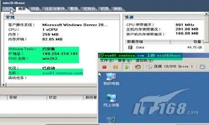 15、如下图所示,便是安装后好且启动的虚拟机系统windows 2003,如果需要在VC的控制台连接此虚拟机。可以使用选定虚拟机win2k3base,然后右健单击"连接控制台",或是点击右侧的"控制台"选项。从图中可以看到虚拟机的摘要信息,以及IP地址(需要更改)。(图8)