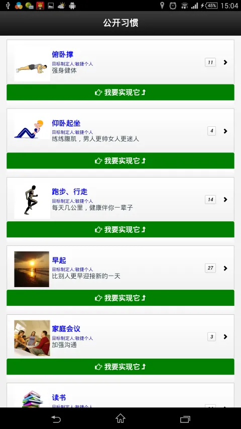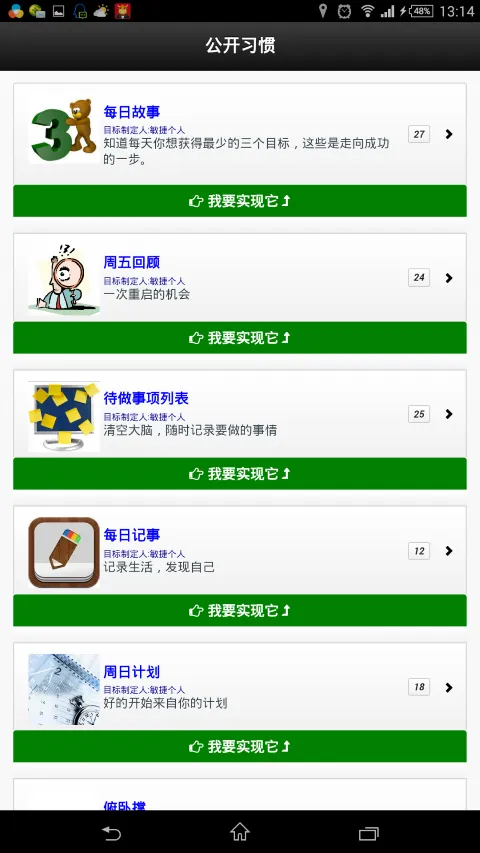 点击上图【添加习惯】,我们可以看到公开习惯列表。这里有敏捷个人常用的习惯。我们现在点击<每日故事>下的【我要实现它】来为自己添加每日故事习惯