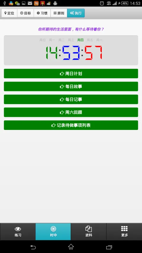 在执行页中可以看到依次排列着周计划、每日故事、每日记事、周回顾、记录待做事项列表。这也是我们以周为生活节奏的排序,先做周计划,然后每日早晨可以做每日故事,每天晚上可以做每日记事来回顾一天,接着就是周回顾。在平常每日,我们可以把随时想到的事情或者怕遗忘的事情记录在最后一个习惯<待做事项列表>中