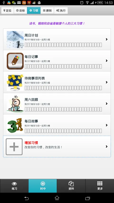你可以按照以上步骤,依次添加系统提供的其他习惯。系统提供敏捷个人习惯:每日故事、周回顾、周计划、待做事项列表、每日记事,还有一些运动习惯。
