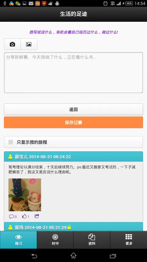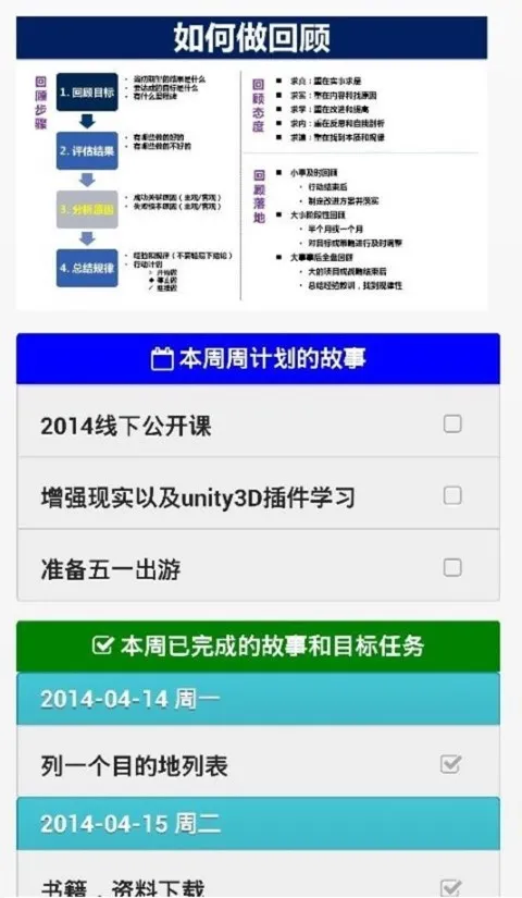 你可以点击这些按钮尝试一下有什么功能,例如周回顾和每日记事会显示如下页面