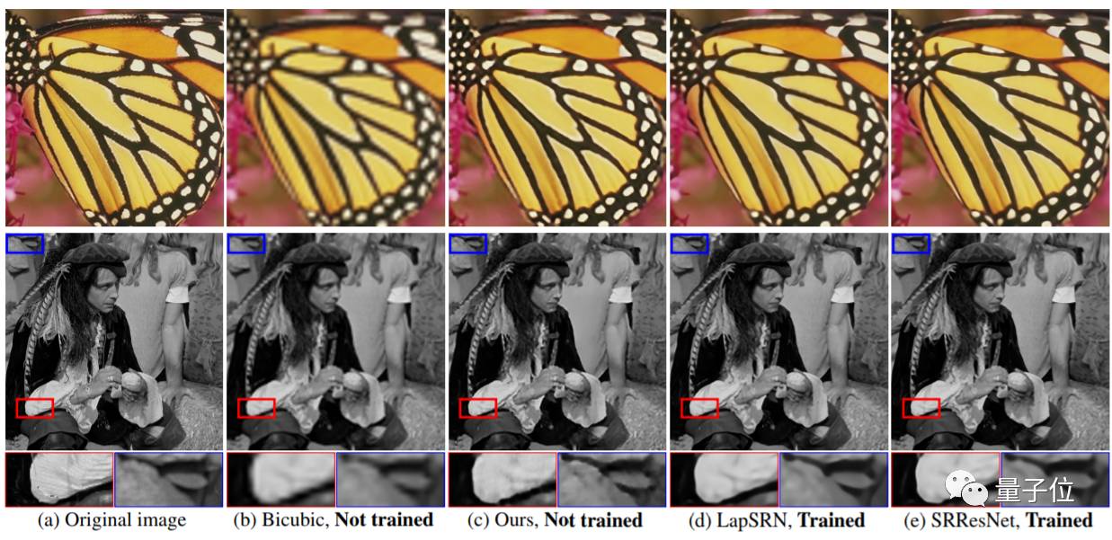 在4x图像超分辨率的演示中我们发现,新方法从使用过任何一张低分辨率的图像,但却生成了更清晰的结果。
