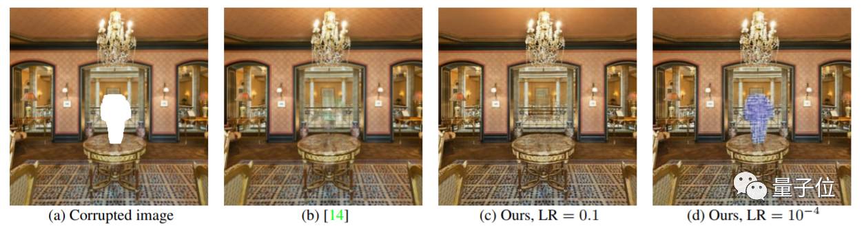 在区域修补示例中,尽管没有学习,但新方法可以成功修复大块区域,在这种操作中,超参数的选择很重要。