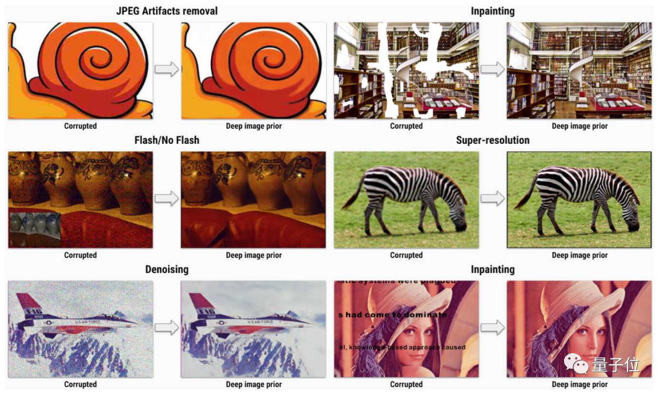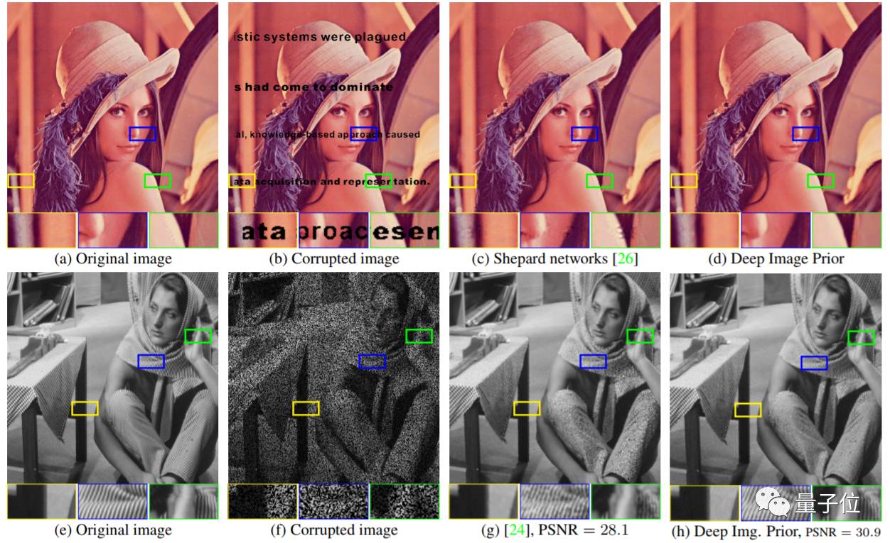 在这些示例中,研究人员用深度神经网络分析了几个图像恢复问题。值得注意的是,研究人员从来没用数据集来训练或预先训练过它们,而是作为一个结构化的图像整体。