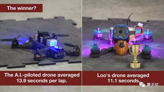 从视频中可以看到,11.1秒后,Ken Loo的无人机率先跨越全部障碍物,赢得冠军。2.8秒后,AI操控的无人机也完成了比赛行程。