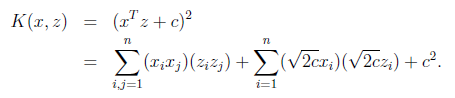 这个时候发现我们可以只计算原始特征x和z内积的平方(时间复杂度是O(n)),就等价与计算映射后特征的内积。也就是说我们不需要花