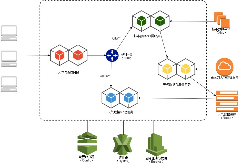 在《基于Spring Cloud的微服务实战》课程中,作者基于Spring Boot + Spring Cloud 技术栈来实现了一个完整的天气预报系统。在课程中,先从 Spring Boot 入手,从0到1 快速搭建了具备高并发能力、界面友好的天气预报系统。而后剖析单块架构的利弊,从而引入微服务架构的概念,并实从1到0实现微服务的拆分。最后引入Spring Cloud 技术来实现对这些微服务的治理,重点讲解了服务注册与发现、服务交互、服务消费、负载均衡、API网关、配置中心、服务熔断、自动扩展等方面的话题。