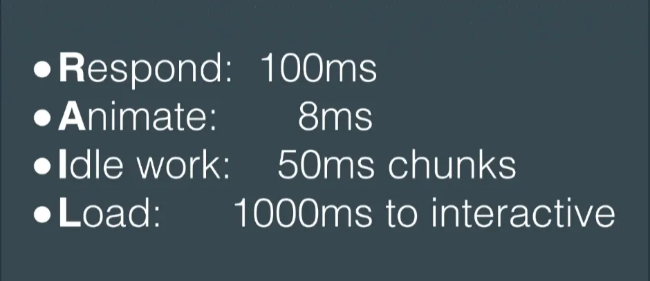 尽管目前没有高性能代码的绝对定义,但却存在一个以用户为中心的性能模型,可以用作参考:RAIL模型。