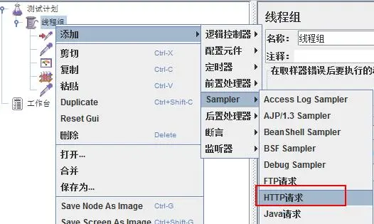 右键”线程组”,添加-Sampler-HTTP请求.注意:不是”HTTP请求默认值”