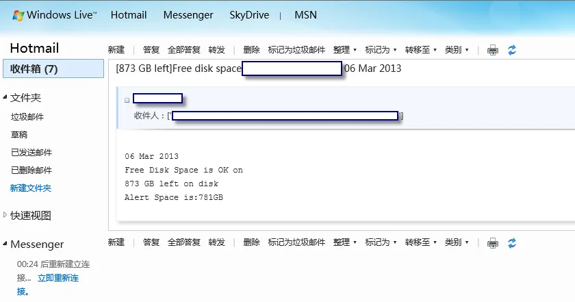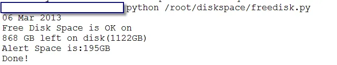 1 #!/usr/bin/env python 2 # -*- encoding: utf-8 -*- 3 4 import os, socket, statvfs 5 from time import localtime, strftime 6 from smtplib import SMTP 7 8 smtp = SMTP() 9 #smtp.set_debuglevel(debuglevel) 10 smtp.connect('1.2.3.4', 25) 11 smtp.login('user', 'pass') 12 13 from_addr = "alert<alert@freedisk.com>" 14 to_addr = ["ag@163.com","ae@163.com","af@163.com"] 15 16 # Limit in MiB 17 LIMIT=200000; 18 19 #Define current Time as Fri, 04 Mar 2011 08:47:10 20 TIME = strftime("%d %b %Y", localtime()) 21 22 MONITOR = os.statvfs("/") 23 SPACE_LEFT=(MONITOR.f_bavail * MONITOR.f_frsize) / 1048576 24 SPACE_TOTAL = (MONITOR.f_blocks * MONITOR.f_frsize) / 1048576 25 26 if (SPACE_LEFT < LIMIT): 27 STATUS = "Free Disk Space is ALERT!!!ALERT!!!ALERT!!! " 28 SPACE_LEFT=SPACE_LEFT / 1024 #GiB 29 print ( TIME+"\n"+STATUS+"\n"+str(SPACE_LEFT)+" GB left on disk\n"+"Alert Space is:"+str((LIMIT/1024))+"GB") 30 subj = "ALERT!!!ALERT!!!ALERT!!!["+str(SPACE_LEFT)+" GB left]Free disk space on www.163.com "+TIME 31 message_text = TIME+"\n"+STATUS+"\n"+str(SPACE_LEFT)+" GB left on disk\n"+"Alert Space is:"+str((LIMIT/1024))+"GB" 32 msg = "From: %s\nTo: %s\nSubject: %s\nDate: %s\n\n%s" % ( from_addr, to_addr, subj, TIME, message_text ) 33 smtp.sendmail(from_addr, to_addr, msg) 34 smtp.sendmail(from_addr, to_addr, msg) 35 smtp.sendmail(from_addr, to_addr, msg) 36 smtp.quit() 37 print ('Done') 38 39 elif (SPACE_LEFT > LIMIT): 40 STATUS = "Free Disk Space is OK on " 41 SPACE_LEFT=SPACE_LEFT / 1024 #GiB 42 SPACE_TOTAL=SPACE_TOTAL / 1024 #GB 43 print ( TIME+"\n"+STATUS+"\n"+str(SPACE_LEFT)+" GB left on disk("+str(SPACE_TOTAL)+"GB)\n"+"Alert Space is:"+str((LIMIT/1024))+"GB") 44 subj = "["+str(SPACE_LEFT)+" GB left]Free disk space on www.163.com "+TIME 45 message_text = TIME+"\n"+STATUS+"\n"+"Total space is :"+str(SPACE_TOTAL)+"GB\n"+str(SPACE_LEFT)+" GB left on disk\n"+"Alert Space is:"+str((LIMIT/1024))+"GB" 46 msg = "From: %s\nTo: %s\nSubject: %s\nDate: %s\n\n%s" % ( from_addr, to_addr, subj, TIME, message_text ) 47 smtp.sendmail(from_addr, to_addr, msg) 48 smtp.quit() 49 print ('Done!') 50 51 else: 52 print (""" 53 A serius problem detected with the script. 54 Please check what mount points you monitor and check that they're in the MON_ARRAY aswell. 55 """ )