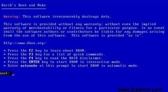 我们知道一般硬盘寿命的在50000小时,现在随着多媒体文件越来越大(特别是1080p高清格式文件)一般情况下80GB 硬盘几年就会填满当然也可能就会坏掉,在限期之前购买一台新硬盘并把资料转移,对个人或企业都是必须的。但如何令旧硬盘在丢掉时保证公司机密不会外泄?这时便要用今介次介绍的DBAN。DBAN全名为Darik's Boot and Nuke,可支持多种档案系统格式,包括Linux的Ext3和Windows的NTFS。其安全性很高,美国太空总署亦在内部指定,硬盘在弃置前必须要经过它来处理。DBAN的工作原理便是反复地在同一磁区上写入无意义的数据,从而把数据还原的可能性减至最低。重写方式支持美国防部标准方式(DoD 5220-22.M这种方法是美国国防部《清理和消毒标准》中的一部分,这种方法仅仅需要覆盖数据几次安全性没有古特曼方法高,但耗费的时间却相对较少。)和业界最高标准Gutmann方式(写入固定值和乱数共35次)。由于只要在Windows下就永远无法完全删除硬盘的内容,因此硬盘删除工具都会以使用Linux平台为前提。DBAN也不例外,用户可用官方提供的工具或者unetbootin工具把DBAN写入USB随身碟,用USB随身碟重新启动系统时便可在Linux环境下直接删除硬盘数据。最新版本是dban-2.2.6_i586。使用时,在bios下设置第一启动为光驱或者随身碟。用随身碟USB盘或光盘启动界面如图2 。